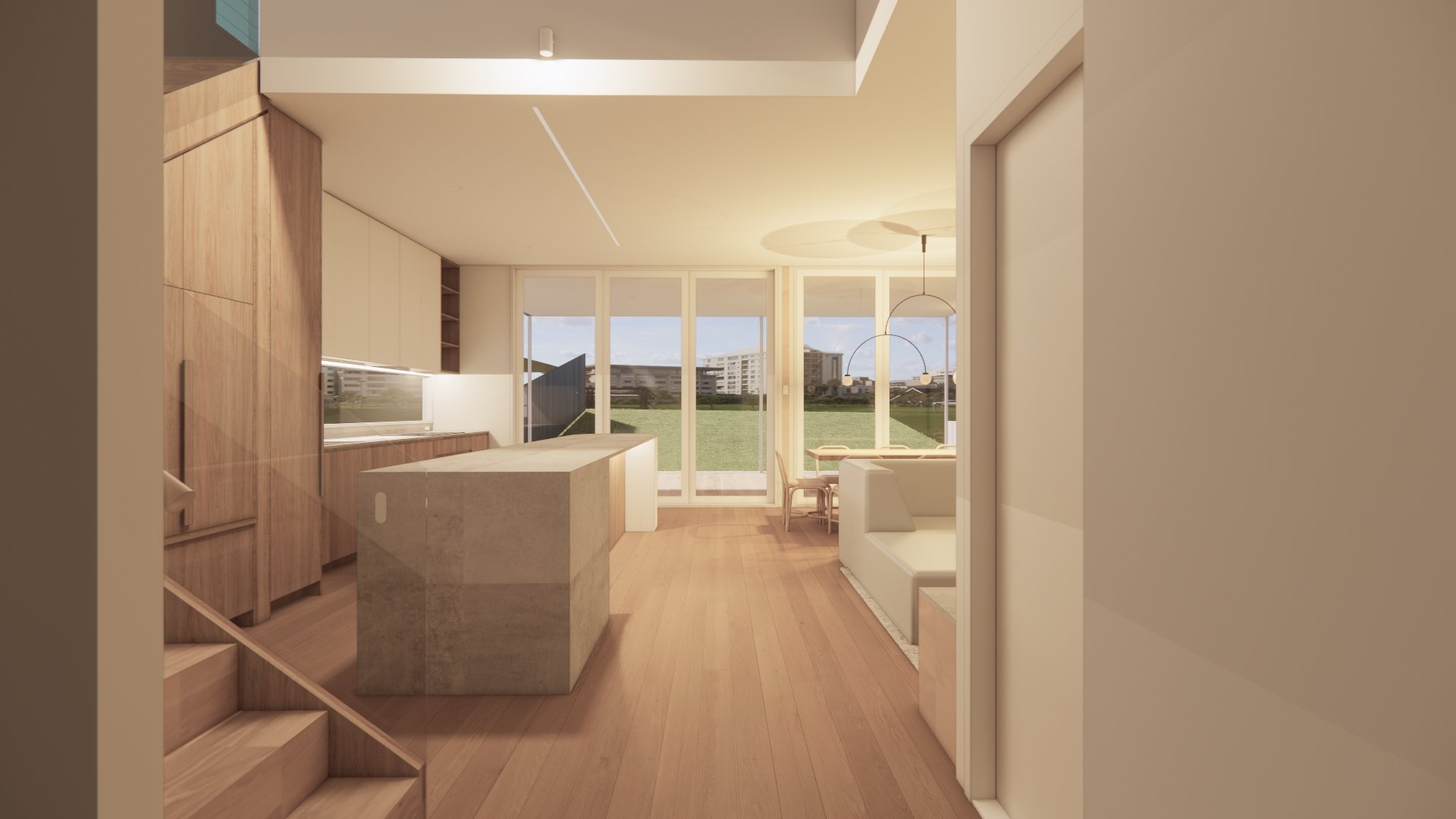 This project is currently on the drawing board. We wanted to create an extension on a narrow suburban lot that connected seamlessly with the backyard, on a sloping site. So we incorporated large banked openings to give a bright and airy feeling, whilst still providing privacy from the neighbors.